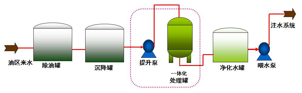 该工艺在来水矿化度≤8000 mg/L,含油≤60mg/L,悬浮物含量≤30 mg/L的情况下,处理后的水质满足含油≤3mg/L,悬浮物含量≤2mg/L,粒径中值≤1.5μm(SS以现场测试为准,含压裂液和钻井液污水除外) 。